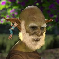 In this imaginative digital fantasy scene, a solemn, green-skinned elder with pointed ears and a flowing white beard listens intently as a tiny, winged figure perches on his ear, mid-whisper. The fairy, dressed in turquoise and glowing with ethereal charm, shares a secret known only to the forest. Surrounded by blurred greenery and violet blooms,