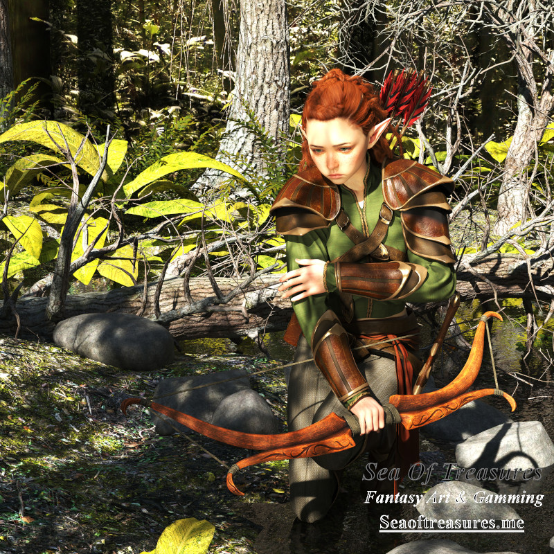 A sentinel of the forest, poised in quiet vigilance. A red‑haired elven warrior clad in green and brown armor pauses with her carved wooden bow in hand. The autumn glade glows with warm twilight tones as she surveys the tracks of her prey in this enchanted woodland. This autumn fantasy scene was brought to life in Daz Studio and polished in GIMP, a showcase of immersive fantasy art perfect for collectors and fans of digital worlds.